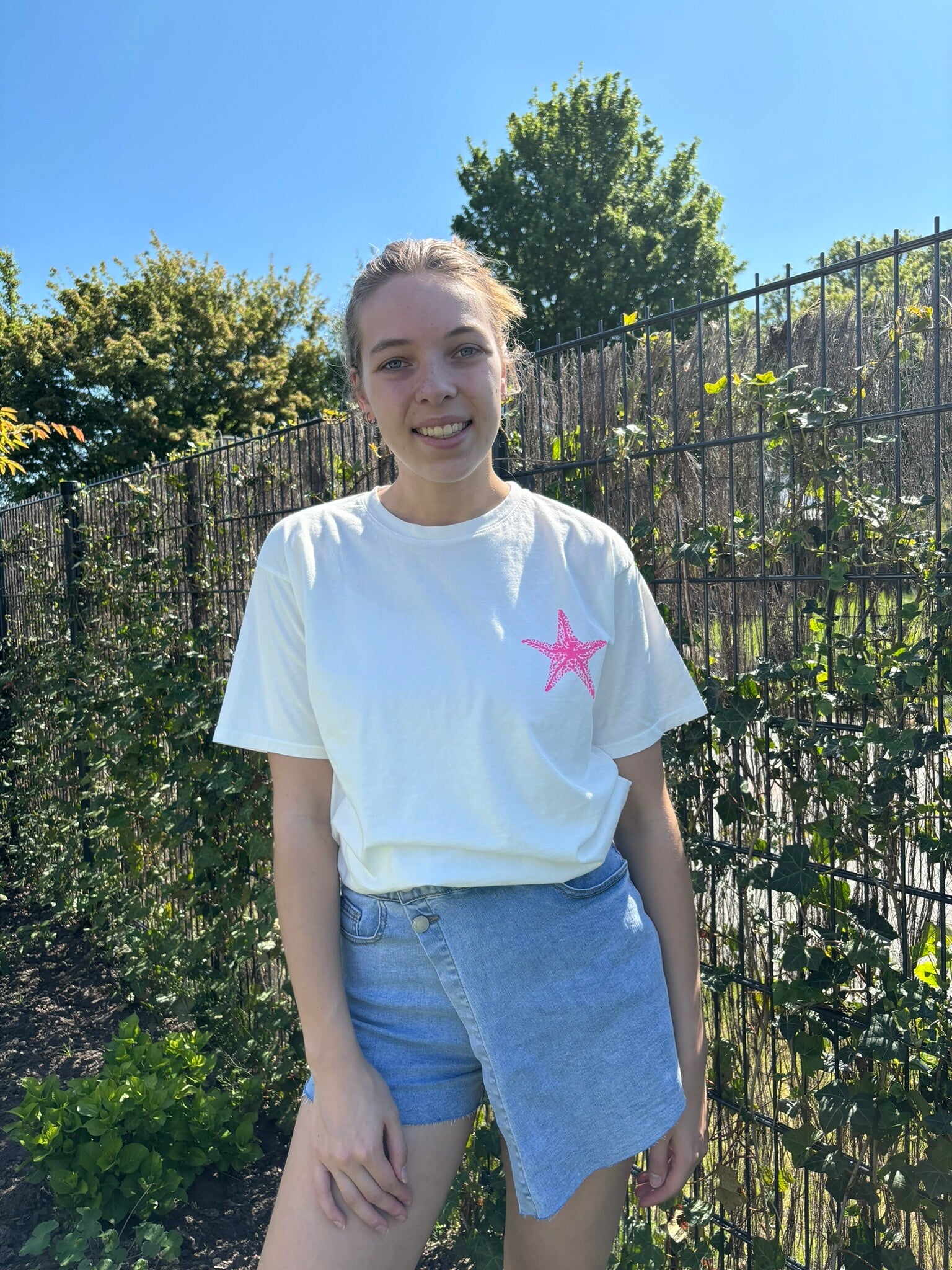 Het shirt is gemaakt van 100% katoen en heeft een hele leuke print op de achterkant!