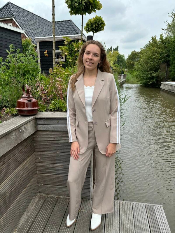 Mooie blazer, verkrijgbaar in donker blauw en beige. De blazers hebben twee witte strepen over de mouw, wat een sportieve uitstraling geeft.