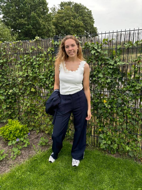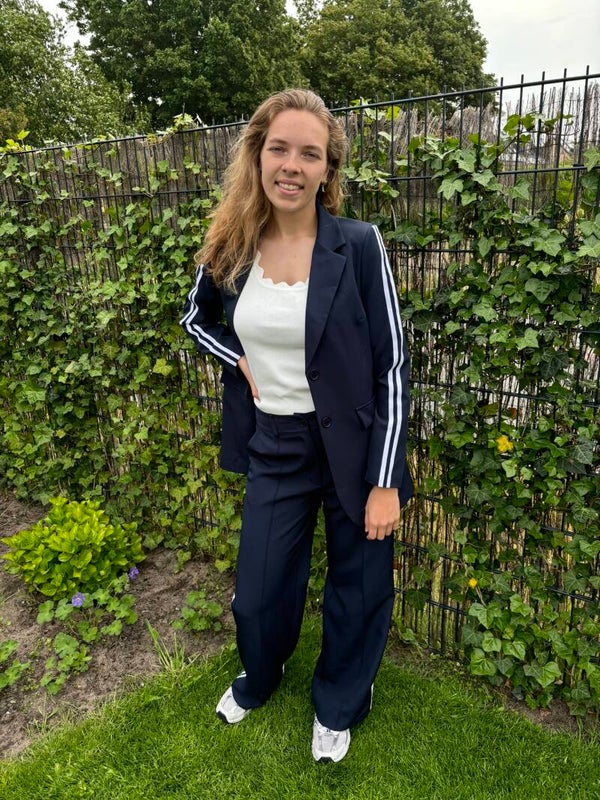 Pantalon in donkerblauw en beige, de pijp heeft twee witte strepen. Samen met de Liv blazer vormt deze broek een prachtig combinatie.