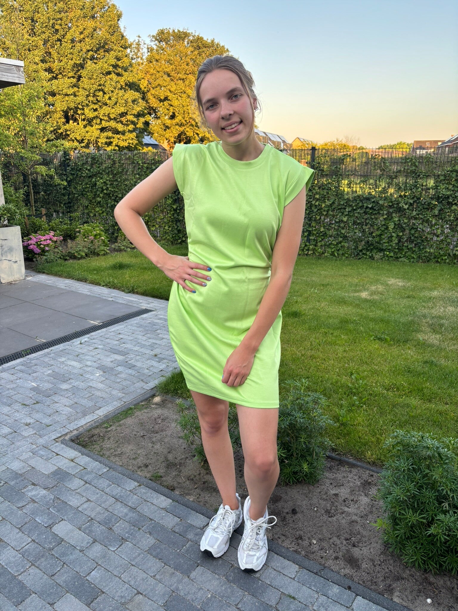 Deze mooi aansluitende jurk is verkrijgbaar in roze en lime.