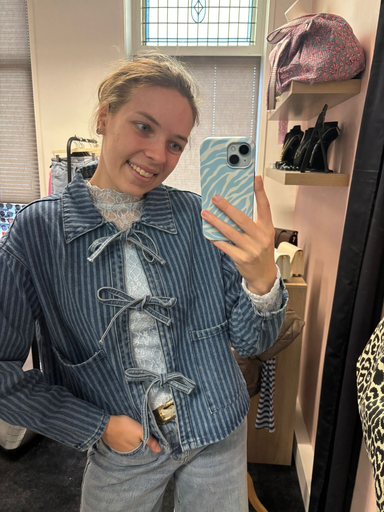 > Je kan hem leuk combineren met het blauwe kantentop.