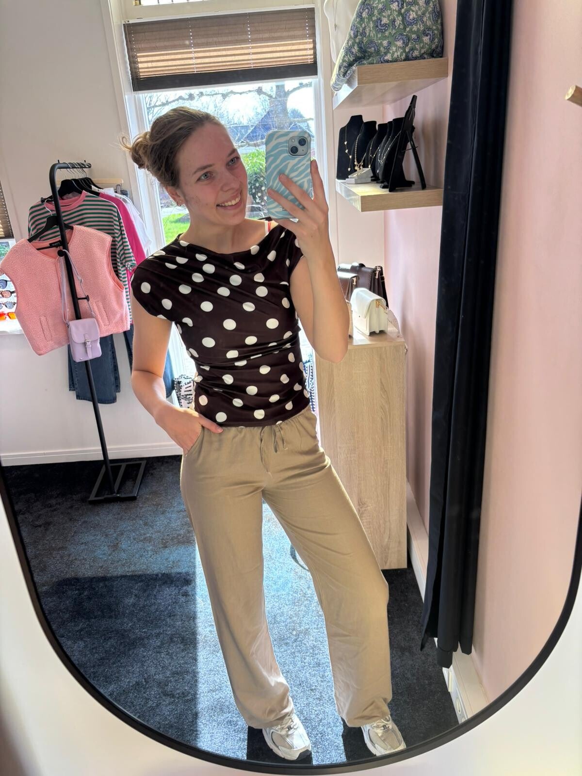 > Model draagt een maat S van de broek.