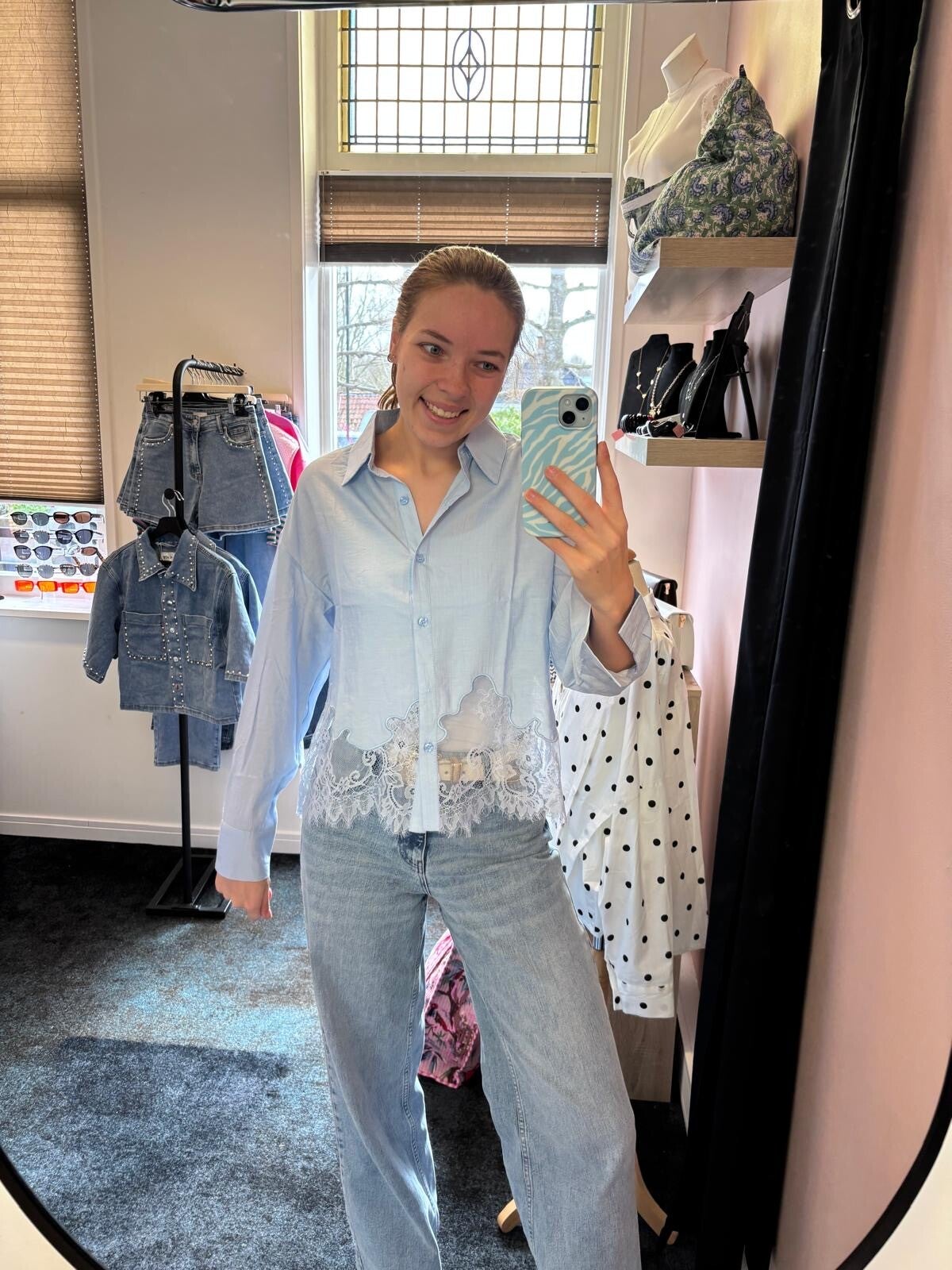 > De blouse gaat t/m maat L/XL.